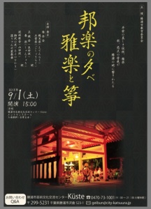 9月1日(土)は勝浦市芸術文化交流センターのエントランスホールにて開催される「邦楽の夕べ・雅楽と箏」に出張出店いたしますので、蔵café荒屋敷の営業はお休みさせていただきます。
