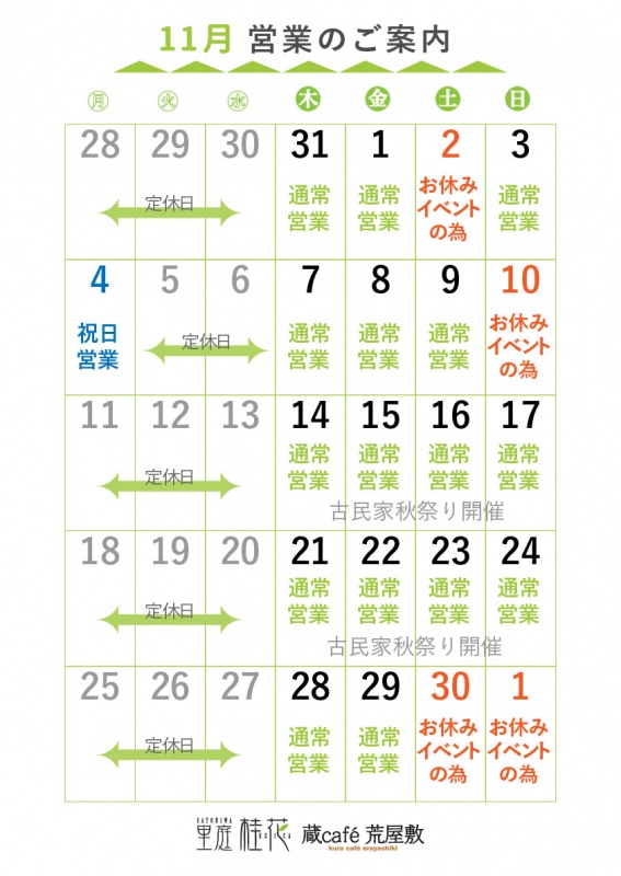 イベントのため 11月30(土)12月1日(日)は蔵café荒屋敷はお休みとなります。