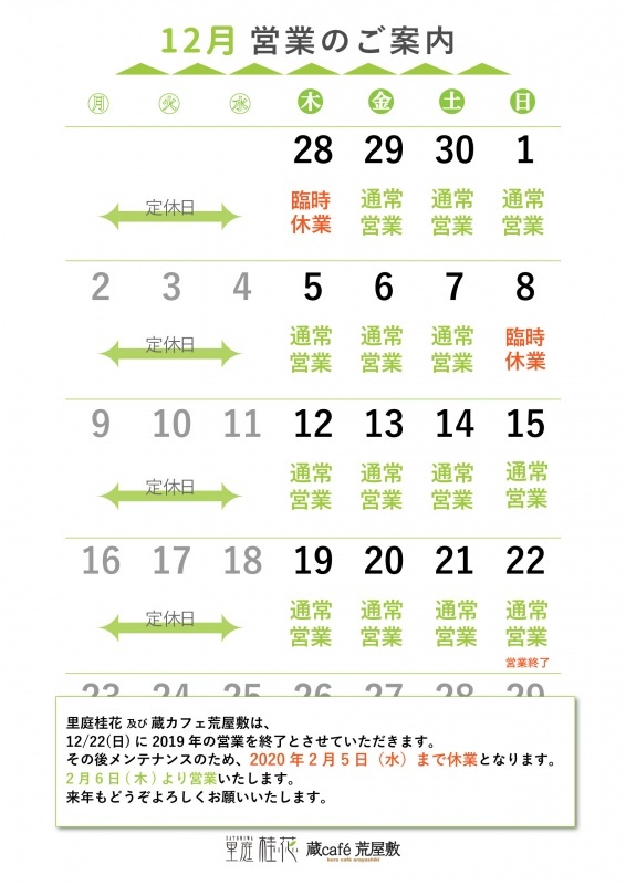 里庭桂花・蔵café荒屋敷は2020年2月5日まで冬季休園させていただいております。